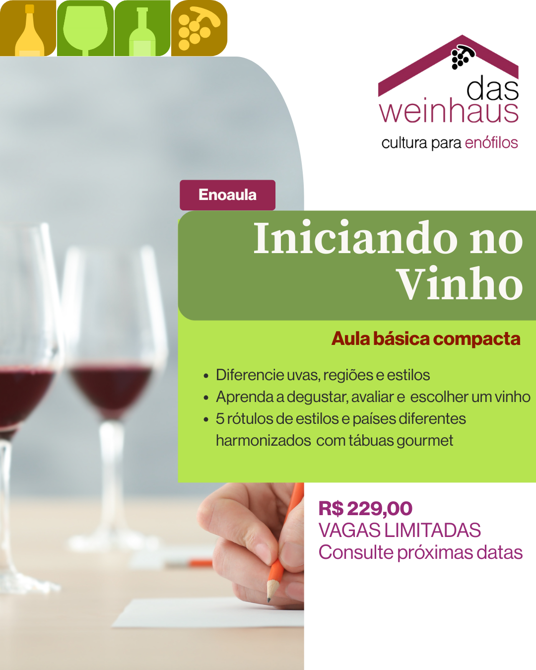 aprender a degustar, avaliar e escolher rótulos, enquanto prova 5 vinhos de estilos e países